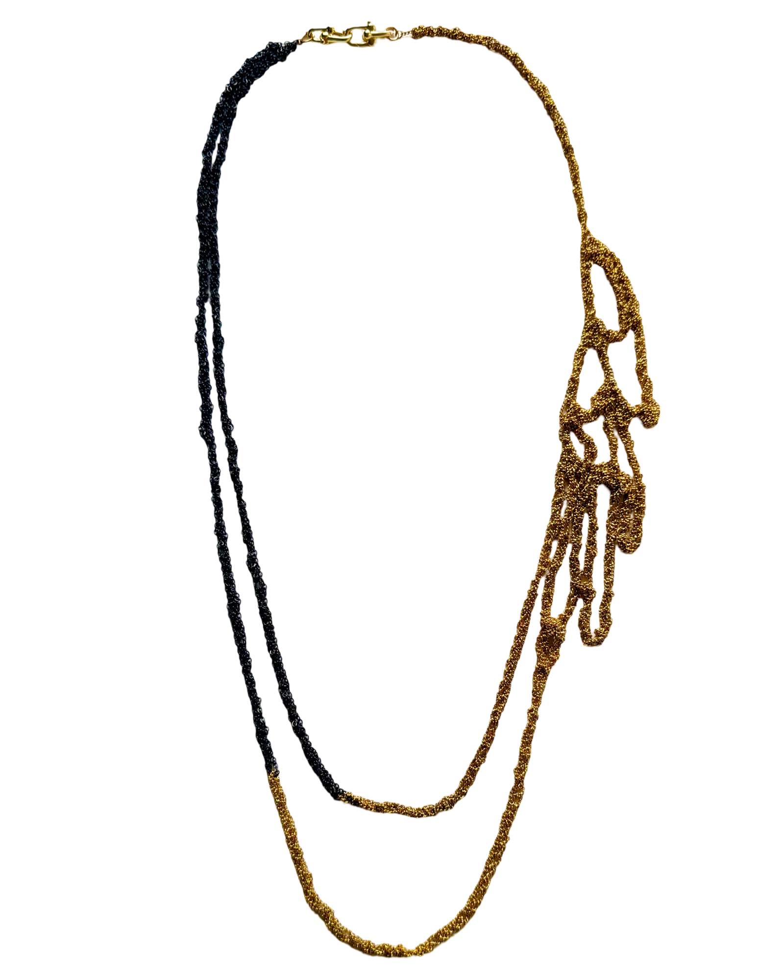 Illusion Collection: designed in black and gold to create that “floating gold” effect when paired with black outfits. A truly one-of-its-kind stainless steel mesh piece. For any gender, for every bold soul.